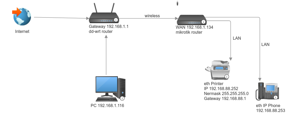 Then create the firewall rule. add chain=forward action=accept comment=“ISP LAN user to printer” in-interface-list=WAN src-address=192.168.1.116 dst-address=192.168.88.252
