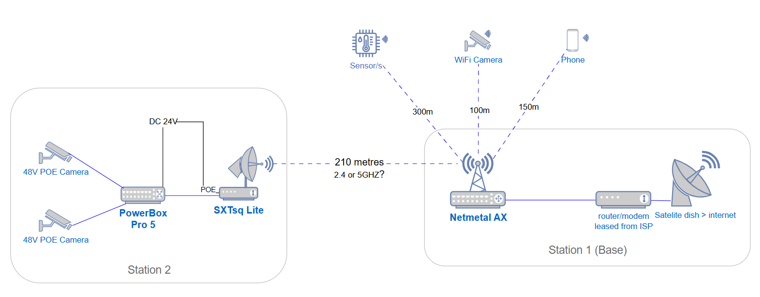 This site should be able to provide a stable connection to probably 2 POE cameras, maybe more or some sensors as well. Cameras need to be of good resolution, and I'd like them to be able to connect to the WiFi internet in the normal way for these new-fangled cameras so I can watch them from in town on a cell phone as well as anywhere on the local network.