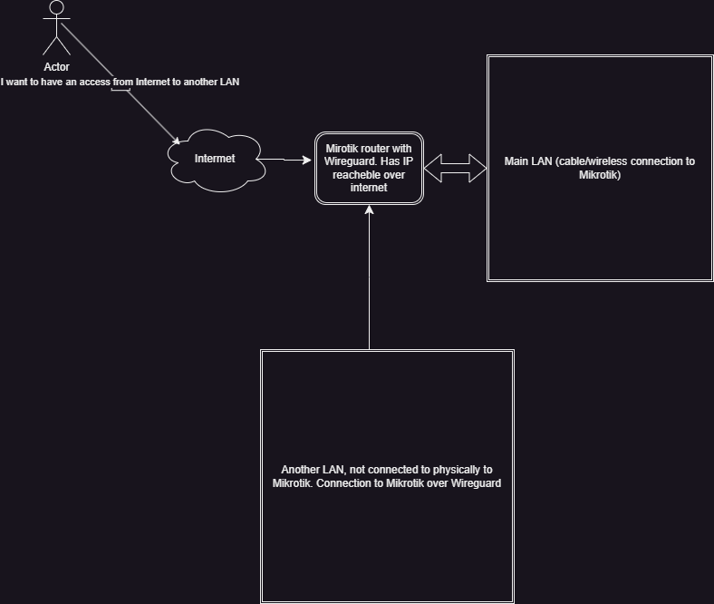 So, the idea is to connect from this another LAN to Mikrotik router (over Wireguard or other VPN), and than on Mikrotik allow traffic redirect from “wild” Internet to PC’s in another LAN