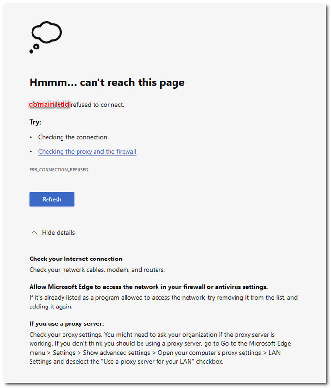 ex1: i got a simple web server on ip 10.10.2.45 with a real registered domain1.tld, i have setup port forwarding, so i can access it publicly no problem at all, but trying to type domain1.tld from anywhere on any of my devices on any of the 3 LANs, i get this page can’t be reached… domain1.tld refused to connect.