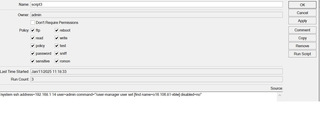 /system ssh address=y.y.y.y user=admin command=“/user-manager user set [find name=x-x.x.x] disabled=no”