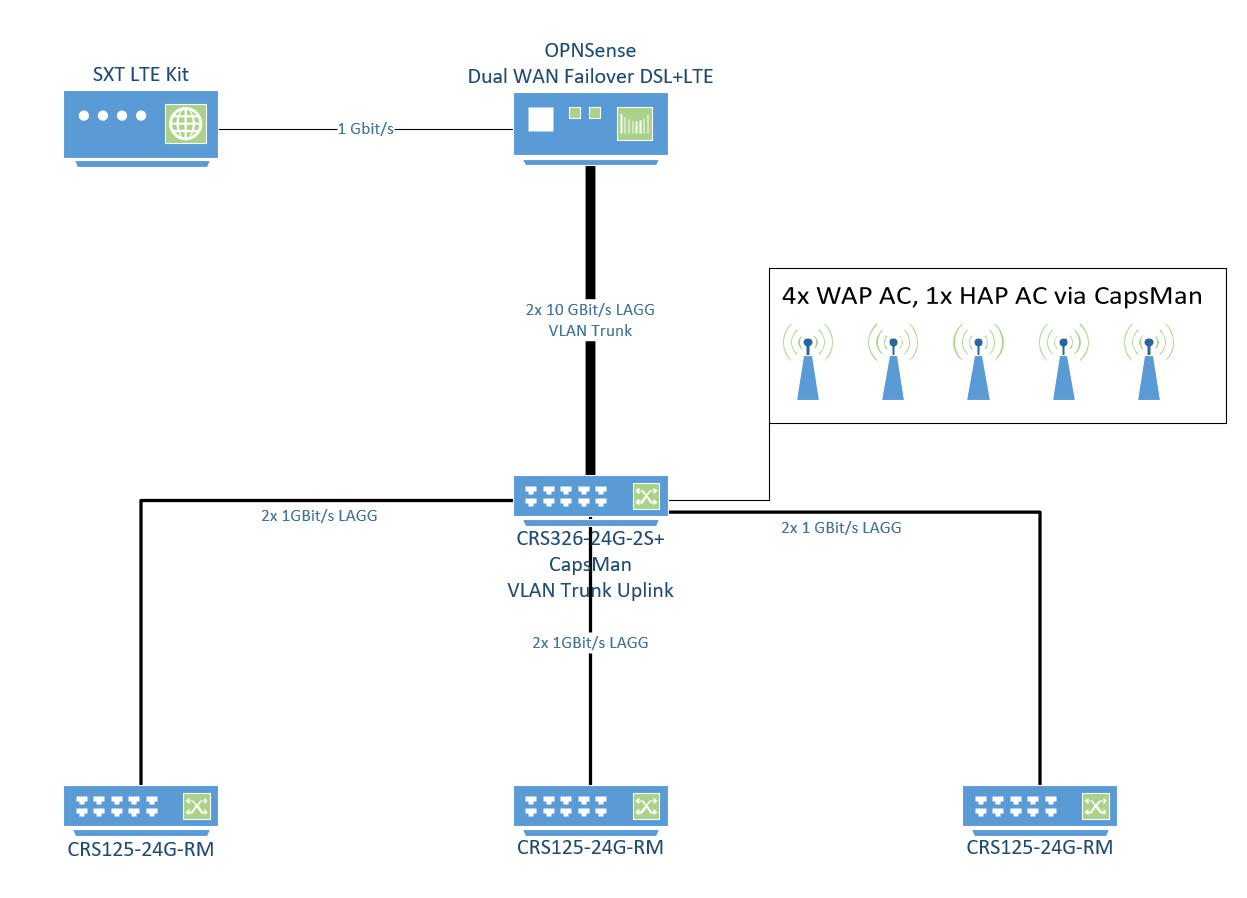 i want to replace a CRS125 with a CRS326 and switch from bridge-based vlans to vlan switching over the switch chip, so that hardware offloading does work for all vlans. i read in the wiki how this can be done with the crs326, but i am not sure if my planned setup is possible with only using one bridge. The ports 1-12 are used for different vlans, which should use sfp2 as trunked uplink to the firewall. the ports 13-24 are just the usual LAN without any vlan tags, with two connections to other mikrotik switches. So basically, the ports 1-12 should be tagged and use sfp2 as trunk, but the other ports should work like a common switch. then, there is a capsman running with different vlan-datapaths which should use sfp2 as trunk, too. One WiFi is standard-LAN without a VLAN, so that one should not use the trunk.