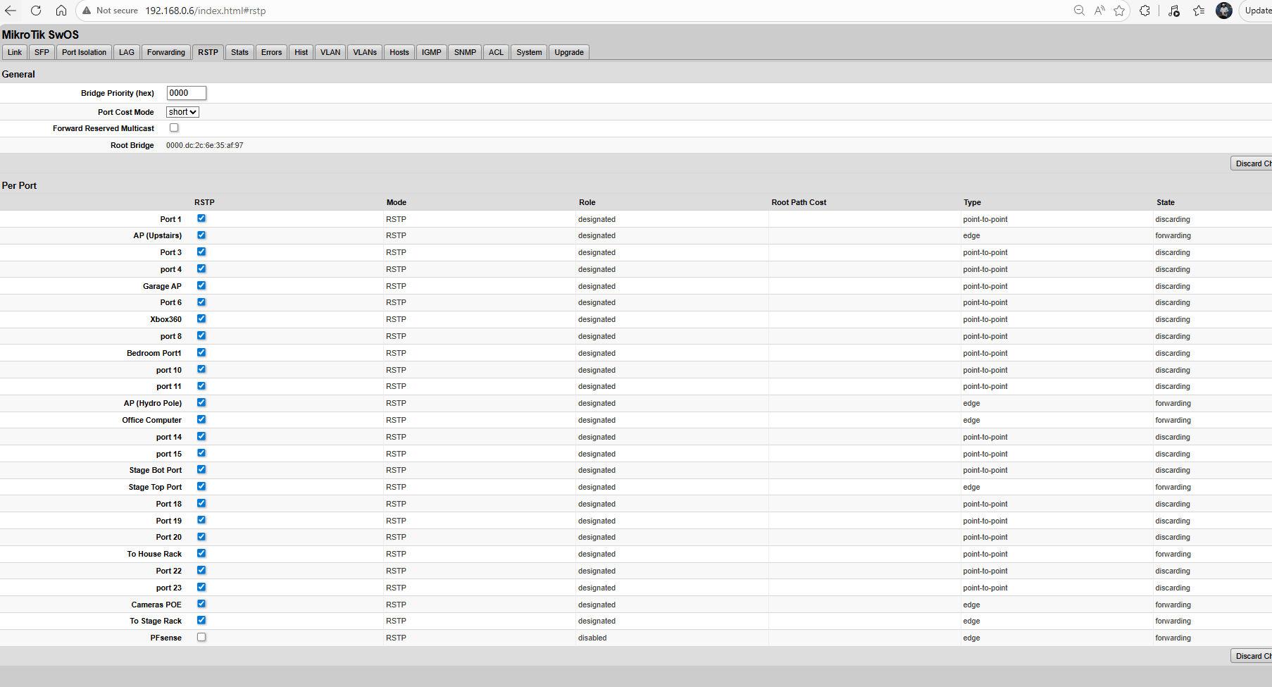i figured i configured things wrong when i cant get “root” and “cost 19” to show up on the rtsp tab to the pfsense box.. it keeps showing up on the link to the 2nd mikrotik switch.. so figured that was the problem too..