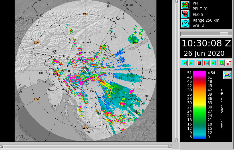 Image shows measurements of otherwise “benign” atmosphere without any significant rain fall, so usually reflections would be blue at most. Blue mostly indicates clouds (without ground-reaching precipitation), green and up indicates actual rain drops (or snow fall) and red and purple colours indicate heavy hail.