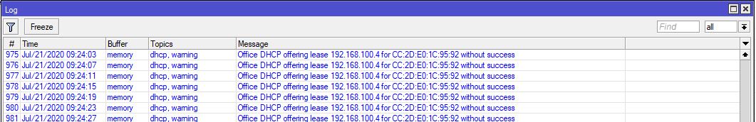 I have an issue with the DHCP-Server in an RB3011. In the log files I get the message: DHCP offing lease for without success.