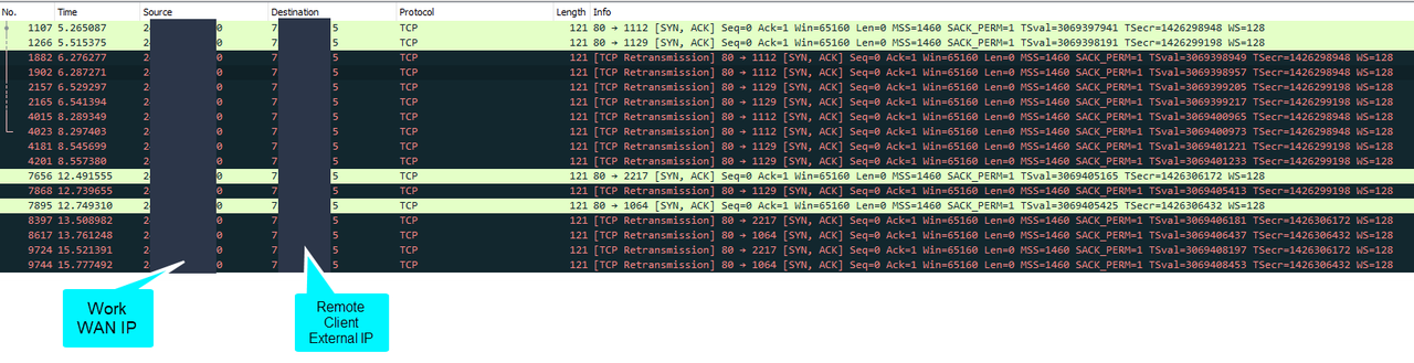 On the MikroTik, I see the reply packets coming from the server, hitting the MikroTik’s LAN interface (assuming it’s getting re-translated), and then I see a packet go out the work WAN interface destined to the remote client’s external IP. The remote client is also behind NAT and I manage that end of the network too. However, many of the packets leaving the work WAN interface on the Mikrotik are retransmits for sequence 0, which confirms the remote client is not getting anything at all back.