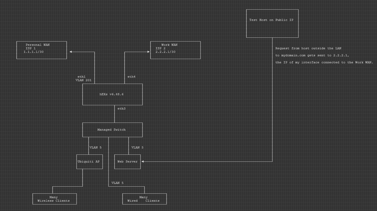 I have a couple of servers at home, and some DNS records that point to my work WAN IP. So, I am attempting to dst-nat (port forward) HTTPS traffic that hits my work WAN (via the A record I’ve published). The traffic is getting dst-nat’d to my server just fine; I can see it show up on when using tcpdump on the server. The server is in one of my LANs with the rest of the clients that normally get routed out the personal WAN, not the work WAN. So, if traffic comes in on the work WAN, having it go back out the personal WAN won’t work. To prevent this, I’m using the mangle feature to apply routing, packet, and connection marks on the incoming dst-nat’d traffic so that I can catch them on their way back out (assuming the “connection” mark will apply to both the incoming and outgoing traffic). Here are my mangle rules: