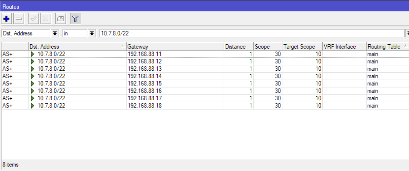 As you can see, it's nearly a 1:1 ratio. Because the next-hops are distinctly added for the ECMP route, and not 6 × 192.168.88.10 and 2 × 192.168.88.11 .
