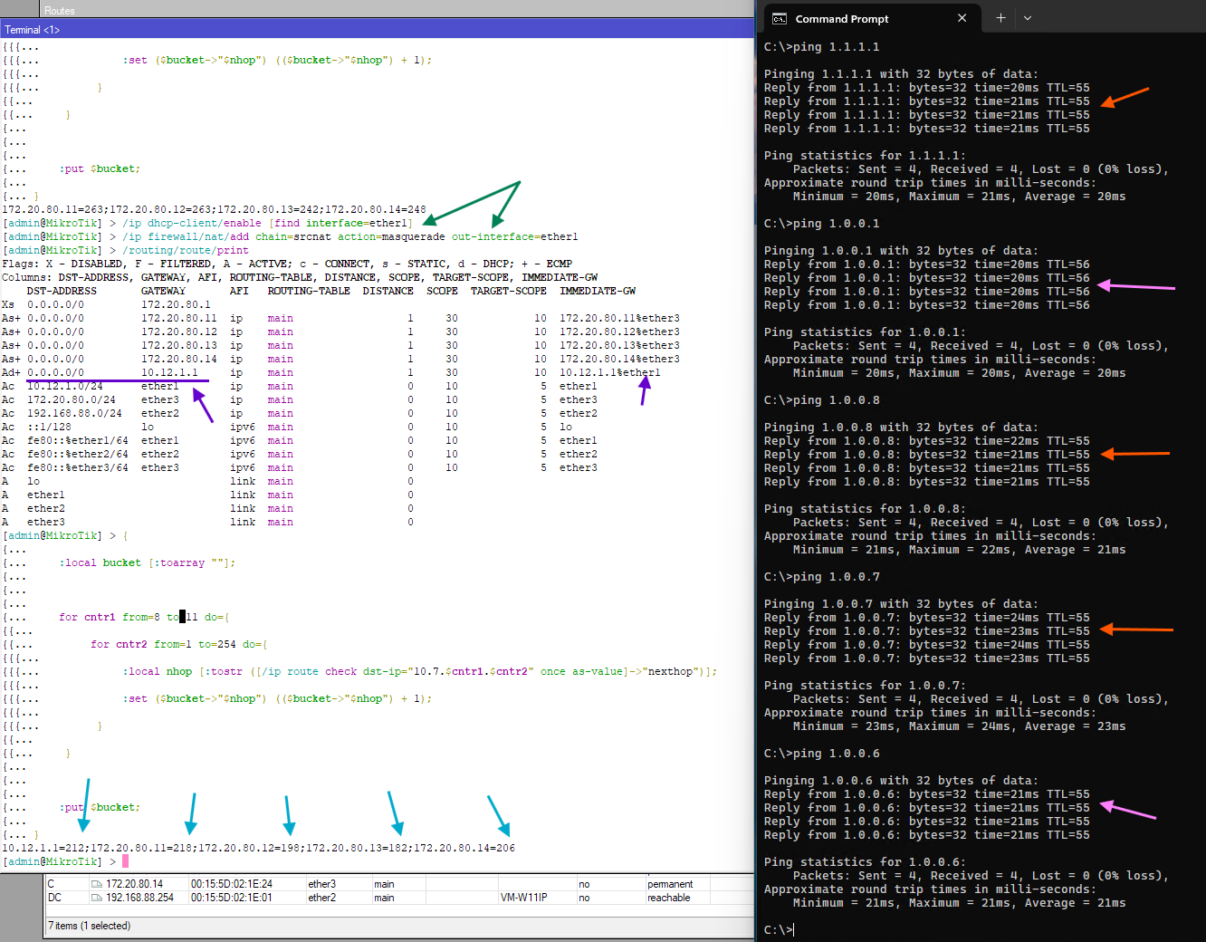 Next the the ARP-copies trick is performed. ARP entries for 172.20.80.11-.14 are added. The default route with gateway=172.20.80.1 is disabled, and the 4 ECMP routes to the bogus gateway addresses are added instead.