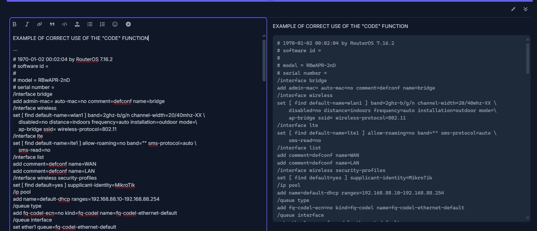 After we redacted our sensitive information it's time to copy it to our post in forum. For that we will use "Code" function in fourm: