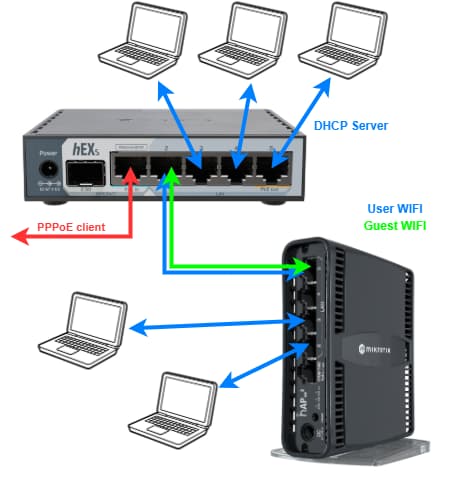 Dear Mikrotik forum users, I would like to kindly ask you for help. I am relatively new to Mikrotik. So far, I use it for common tasks and I love it. What I am trying to achieve now is to implement guest WIFI and I want to do it properly, therefore, using VLANs as I understood other topics here. I understand basic concept - trunk port, tagged and untagged ports.