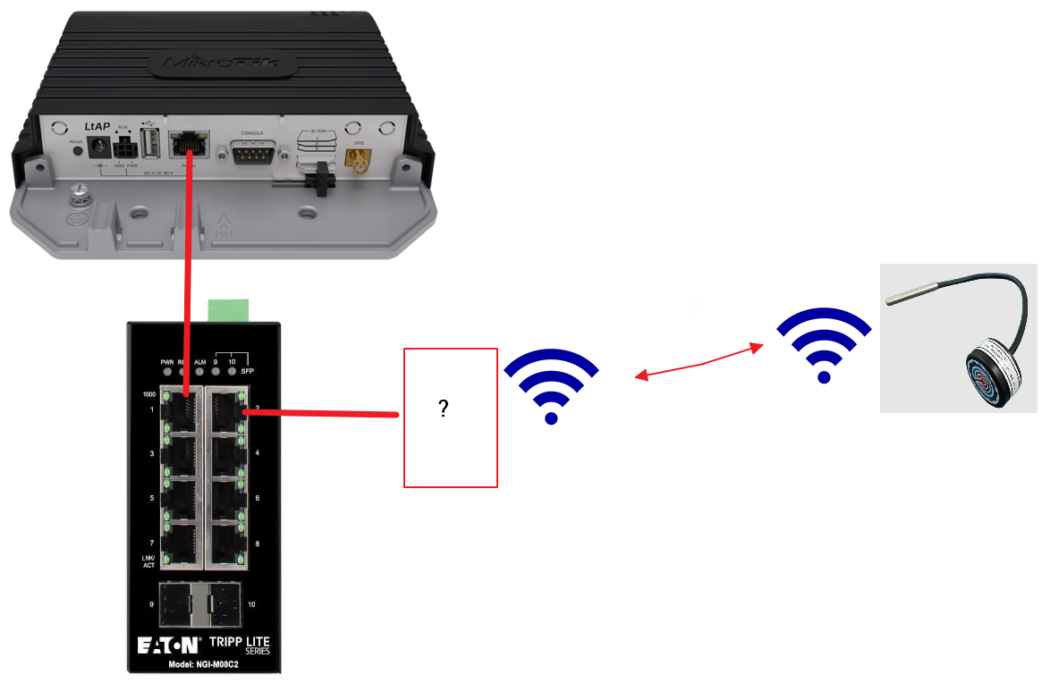 Based on the attached diagram, could you please advise how to choose the appropriate device for the component marked with a red square and question mark? This device appears to connect the Eaton Tripp Lite switch to the wireless network. Are there specific requirements or recommendations for selecting this device to ensure compatibility and reliable communication with the wireless sensor?
