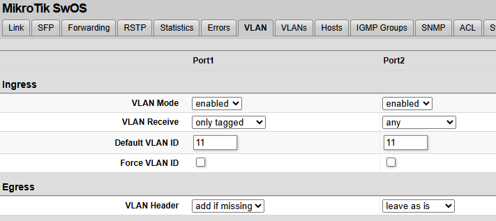 add bridge=bridge frame-types=admit-only-vlan-tagged interface=ether1 pvid=11