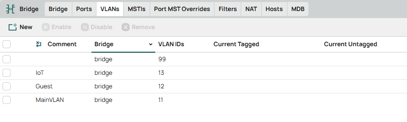 add comment="VLAN 99" interface=bridge name=ManagementVLAN vlan-id=99