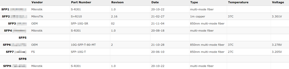 I just bought a CRS309-1G-8S, which are surprisingly hard to find right now, and it had been working correctly. When I got it, I was able to see the voltages and temperatures for each individual SFP+. After I upgraded the OS, the temperature and voltages disappeared. I tried doing a hard reboot and that didn’t work, I tried doing a factory reset and that didn’t work, and I tried reverting the OS but the revert didn’t take. Any ideas? I run SwOS because I don’t really need any advanced features since the switch is for my home lab, and out of the box the switch was on version 2.7 and it is now on version 2.13. Also, as you can see from the attached image, it’s reporting the wrong info for SFPs, they’re 10GBase-T. Any help would be greatly appreciated