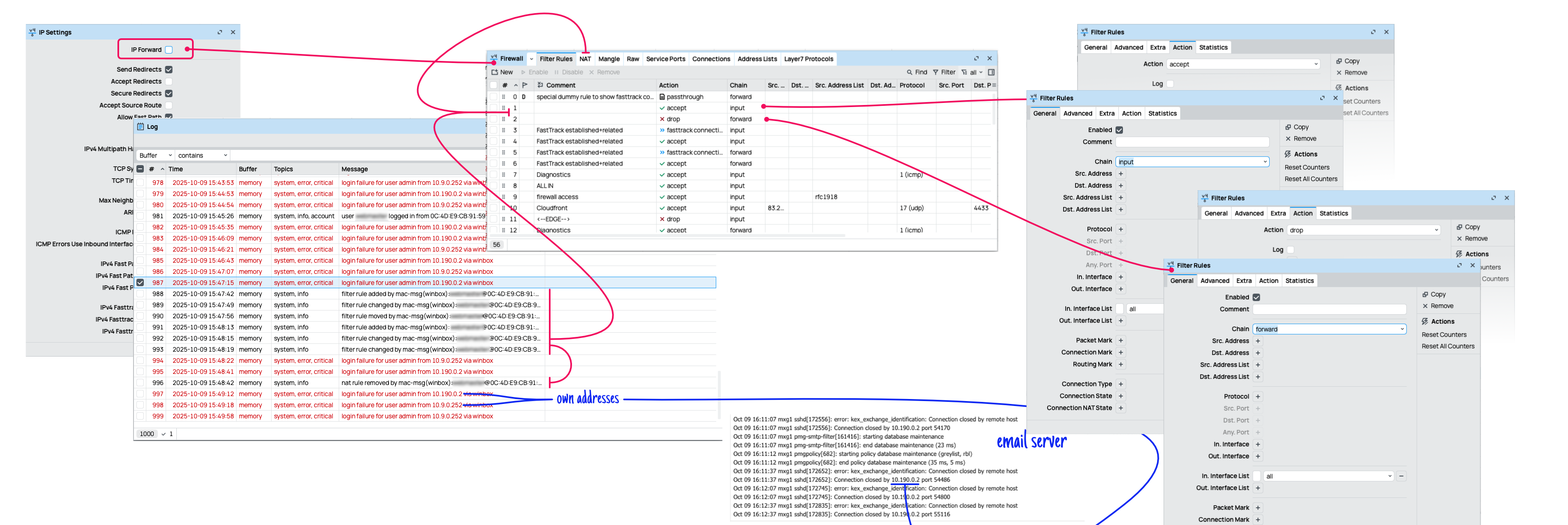 Today while diagnosing something about email, I noticed CHR was attempting to make SSH connections to my email gateway. I noticed in the CHR logs before failed attempts to connect to itself, but since it’s multihomed and it has two interfaces in the same subnet (two NICs, one a VLAN trunk with all the interfaces, the other NIC it’s on one VLAN only as a safety for lockouts), I just figured it was discovering itself or something.