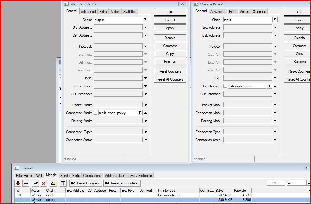 *Note all Counters for the connection mark/packet mark & routing mark is counting as traffic hits the interface…