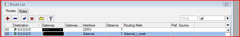 Then i created a route with destination 0.0.0.0/0 with the appropriate gateway for the second interface with the routing Mark external.