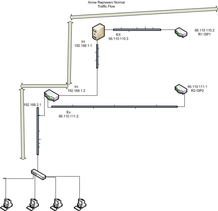 *The normall flow of traffic is from the PC’s to the Mikrotik, to the server, which in turn NATS the traffic using 66.110.110.3 as the external IP.