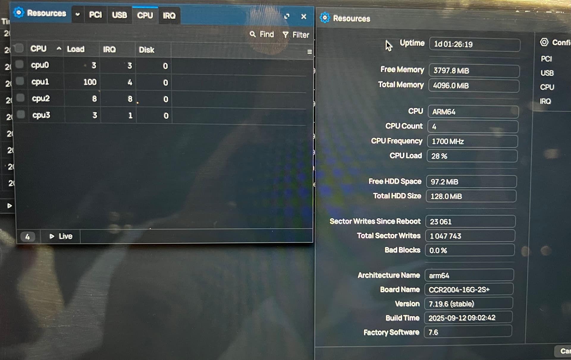 Hi, sometimes with several ccr2004-16G-2S+ routers, one of the CPU cores suddenly gets 100% used and the hotspot service no longer works.