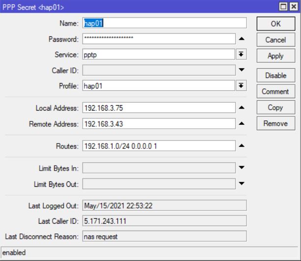 I created a PPTP server on rb1 with these parameters (cleaned):