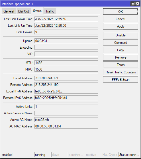 2025-06-16 13:04:14 pppoe,ppp,info pppoe-out1: terminating... - disconnected