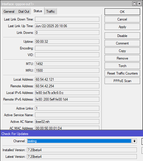 2025-06-19 13:30:47 pppoe,ppp,info pppoe-out1: terminating...