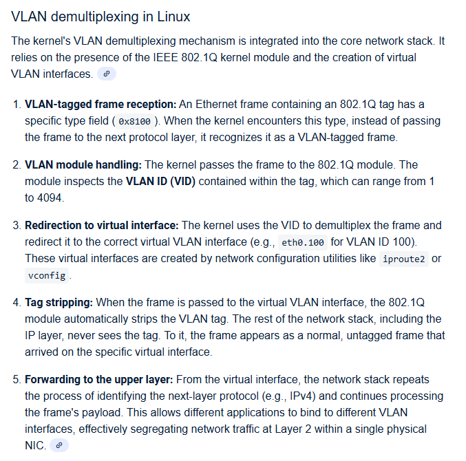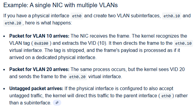 Next in line of the concepts is the vlan interface. These simply allow us to separate vlan tagged (with the specific tag) traffic from untagged (which appears directly on the interface) on ethernet type interfaces; also they take care of injecting them. Again, a fairly simple concept.