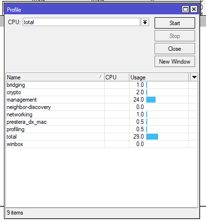 After updating my CRS326-24s-2q from version 7.19.6 to version 7.20.2, I have high processing. If I go to Tools, Profile, the problem is detected in the management. The high percentage shows peaks of up to 70%.