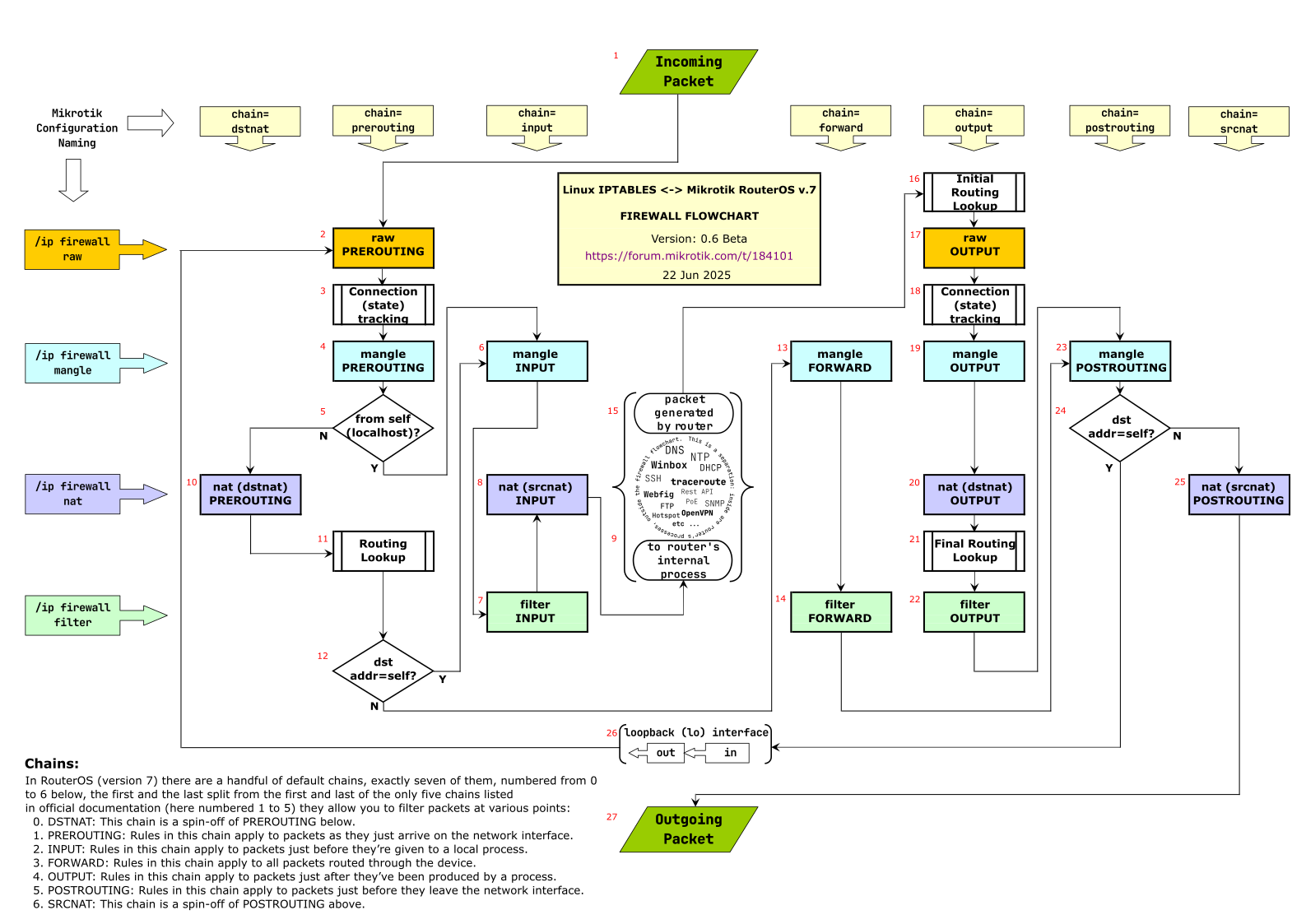 Next is #11 where the routing table is consulted and the route & out-interface is determined. Then we have #12 (branch N is taken because the dst-address has been changed by DSTNAT is no longer of the router) -> #13 -> #14 (here is your filter rule in the forward chain) -> #23 -> #24 (branch N) -> #25 (here are SRCNAT rules such as masquerade) -> #27 (sent to out-interface).