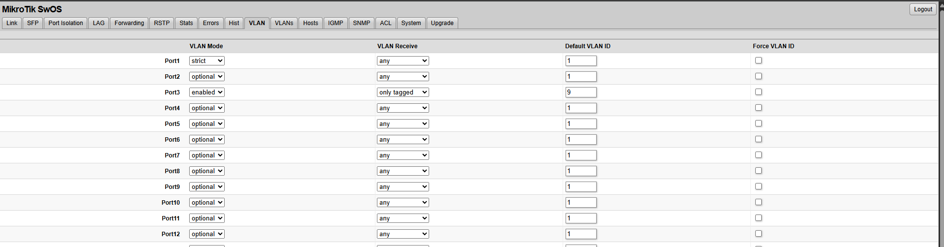 - which port from AX3 is used to feed CRS326 ? Is that port defined as trunk incl VLAN9 ?