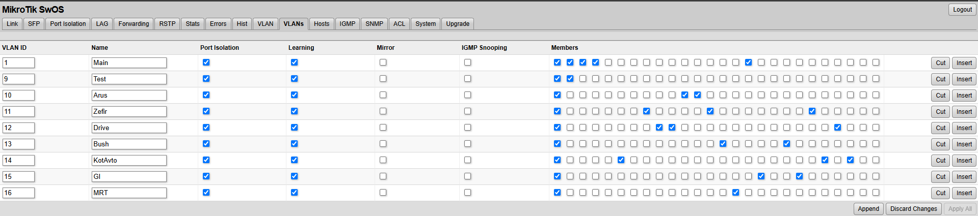I use vlan to split the network. I have hap ax3 installed as the main router. next to it is the crs326, on which the cranes work as they should. The crs326 is backed by the css326, but other vlans with ID 1 no longer work on it.