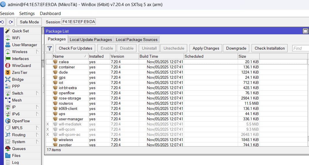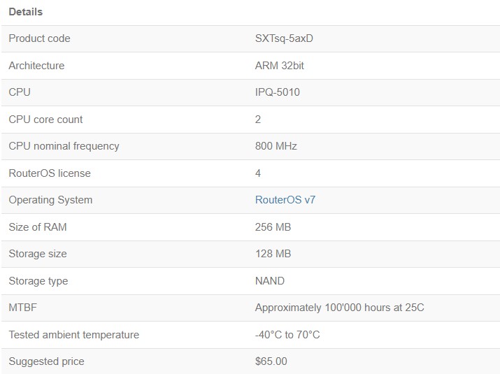 I have a MikroTik **SXTsq 5 axD** (Product code: SXTsq‑5axD, ARM 32‑bit, CPU IPQ‑5010, RouterOS v7, license level 4).